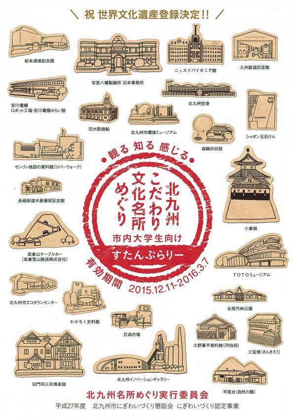 「世界遺産のある街北九州」の史跡・名所を巡り、北九州の歴史と文化に親しんでいただくイベントです。対象は、市内大学に在学の1・2年生約11,000人。近い将来、社会人となる学生に北九州市及び地場企業の魅力に接してもらうスタンプラリー企画です。